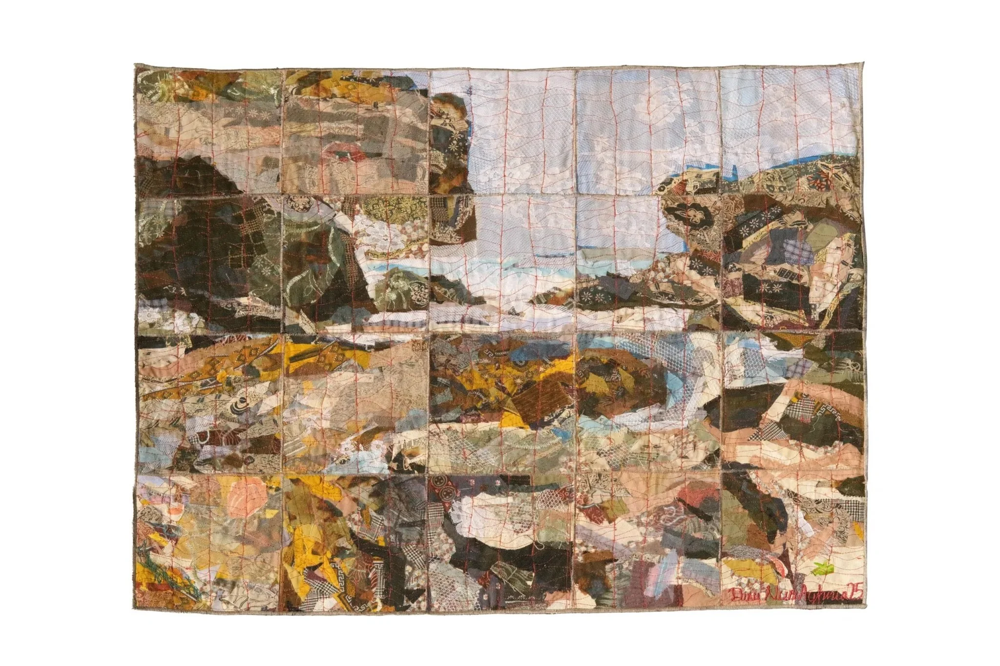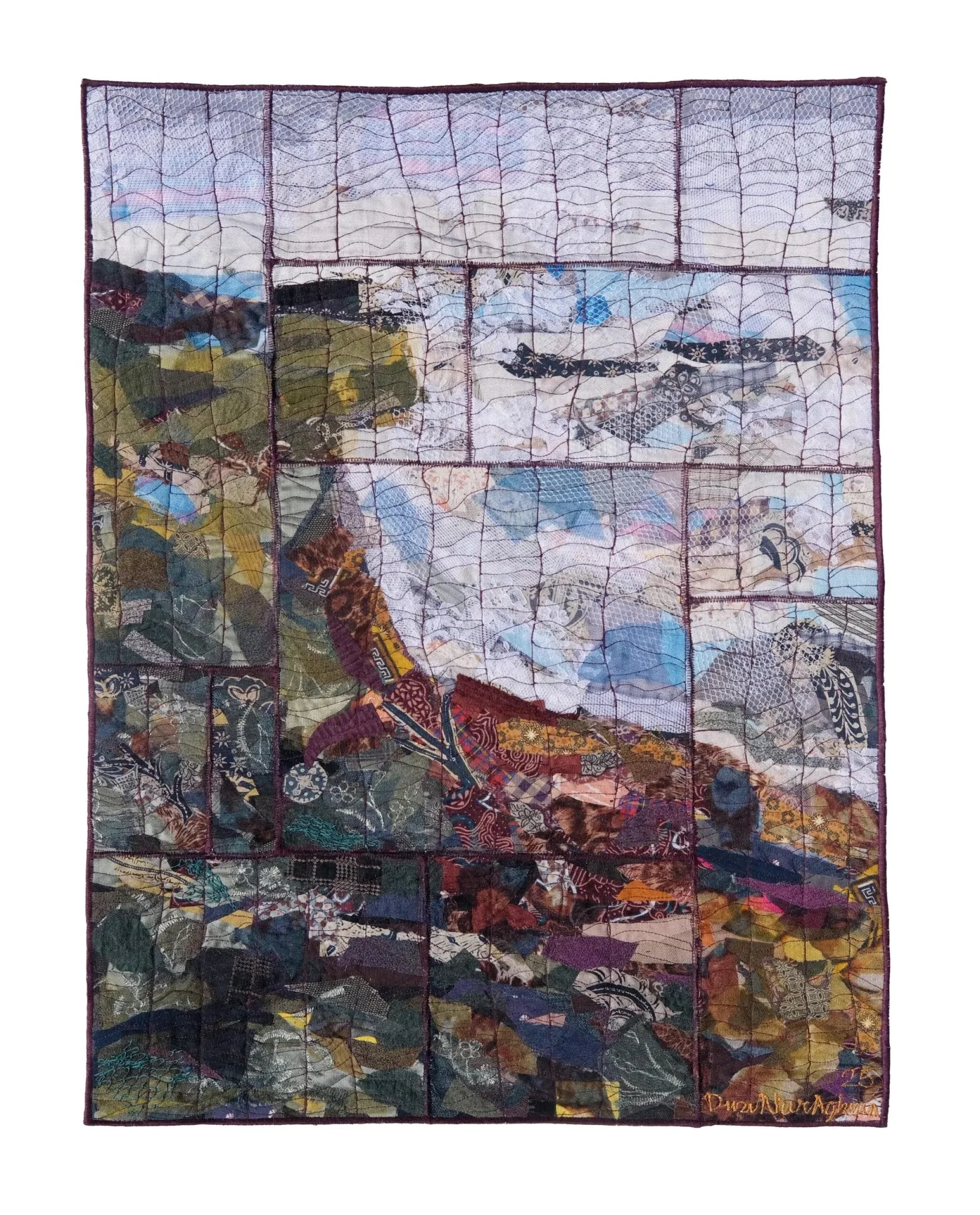 In her latest works, Dini Nur Aghnia has turned to embrace the materiality of textiles. The familiar contours of hills and rivers reveal themselves through the quilt-like assemblage of The Space Between the Swells - where fabric scraps are pieced together, in a grid, to compose the recollections of a landscape scene.